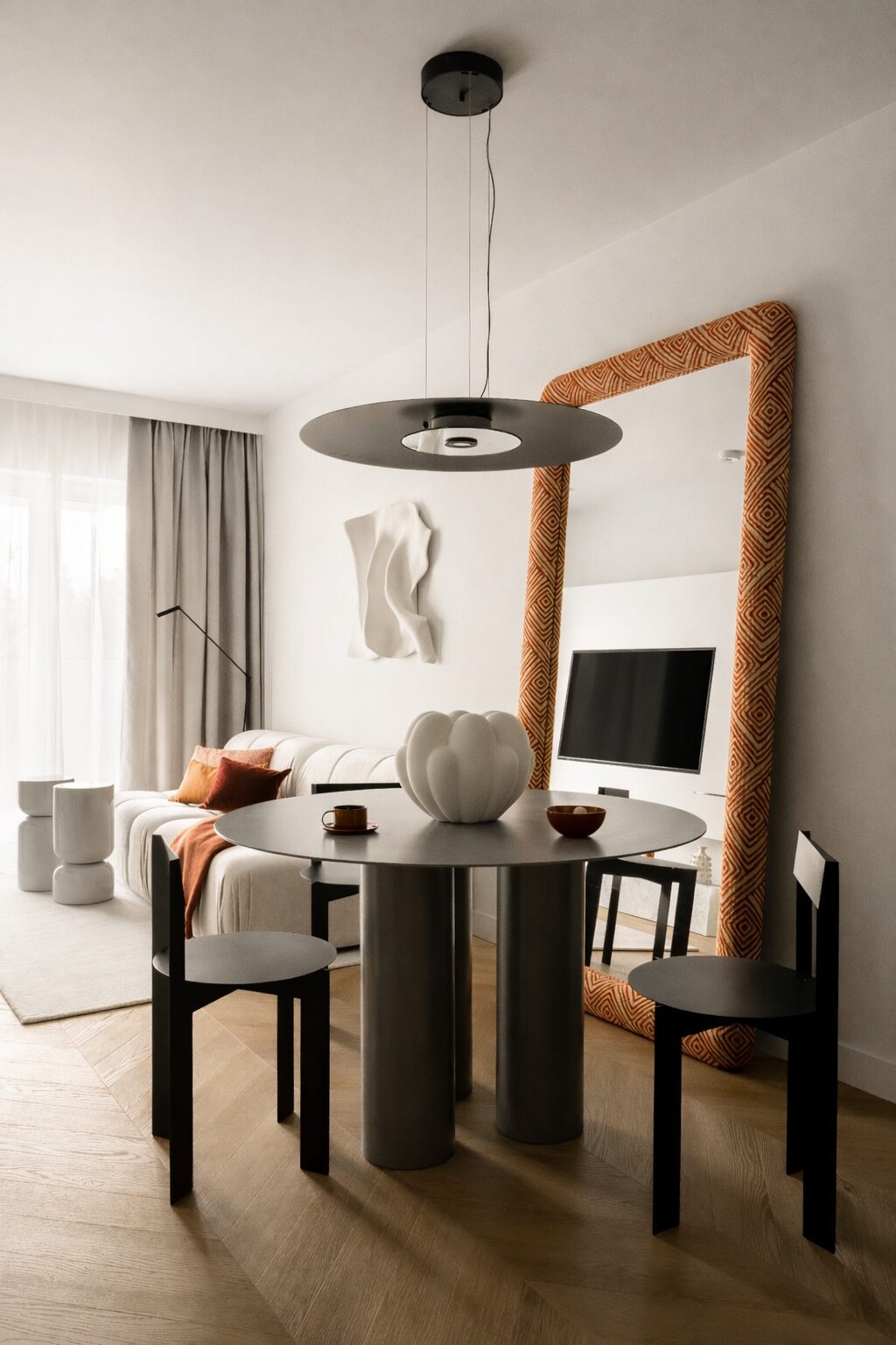 To rzeźbiarska interpretacja klasycznego lustra. Oprawa została wykonana ręcznie i w całości obita tkaniną. Organiczna forma ramy, miękkie zaokrąglenia oraz wyraźna struktura materiału tworzą nieoczywistą, taktylną kompozycję. Lustro idealnie odnajdzie się w przestrzeniach premium: salonach, jadalniach, sypialniach i holach.